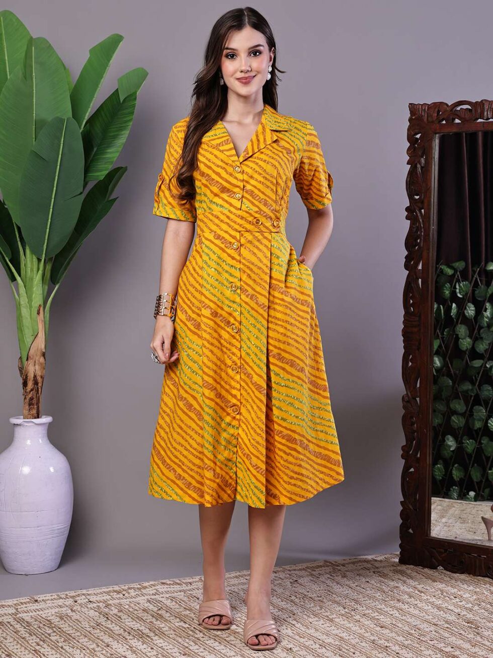 Be the first to review “Women’s Yellow Printed Cotton Shirt Dress”